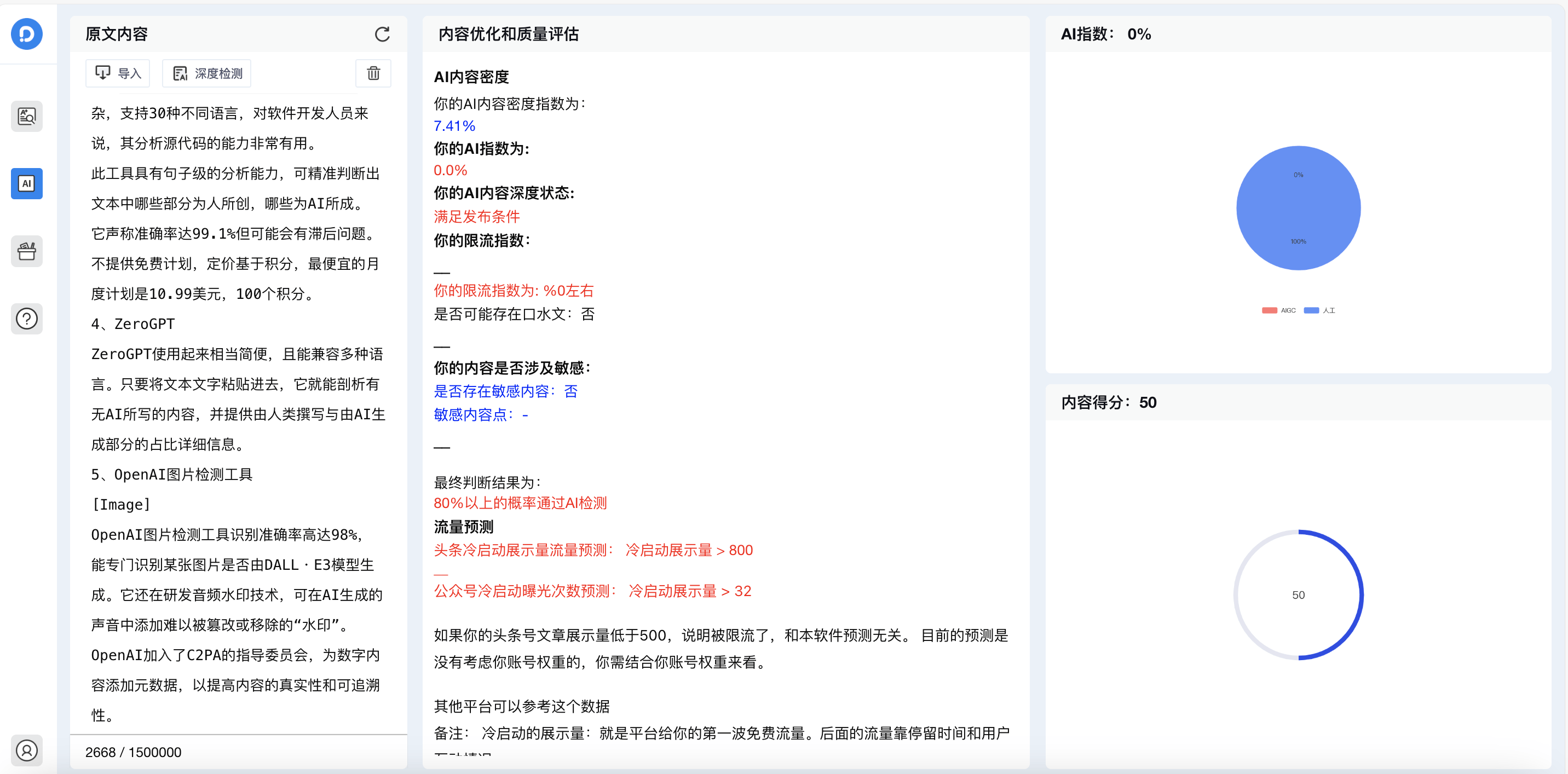 该系统配置有先进的顶尖科技,可以从多维度精准测量AI内容的密集度、深度及质量的好坏。目前来说,其在AI监测方面处于行业领先地位。