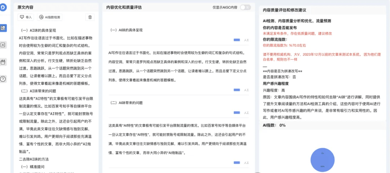 ContentAny是一款强大的工具,不仅能进行免费AI检测,还能去除AI味道、进行流量预测、效果优化和限流检测,可提升阅读量40%以上。
